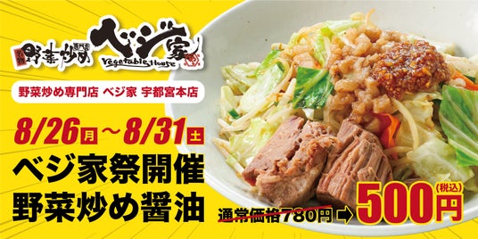株式会社sommet farm(本社:栃木県宇都宮市泉が丘1丁目16-19、代表取締役:大塚 ⿓之介)は、「野菜炒め専門店ベジ家 宇都宮本店(住所:栃木県宇都宮市峰4-10-28 1階、電話:028-678-4404)」にて、'24年8月26日(月)~31日(土)の期間ベジ家祭(ベジヤサイ)を開催します!