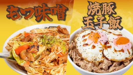 左:もつ味噌 お好み(野菜マシ/肉マシ/ニンニクマシ/アブラマシ) 右:焼豚玉子飯
