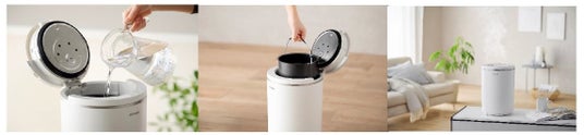 今回発売する「スチーム式加湿器」は、当社のフライパンで採用している最も非粘着性の高いコーティング技術(※2)を水タンクの内側に使用しており、水垢などの汚れが付きにくく、スポンジ(※3)で擦り(こすり)洗いできるので容易に手入れできます。水タンクと上ぶたは本体から取り外して水洗いできるので、加湿蒸気を清潔に保てます。