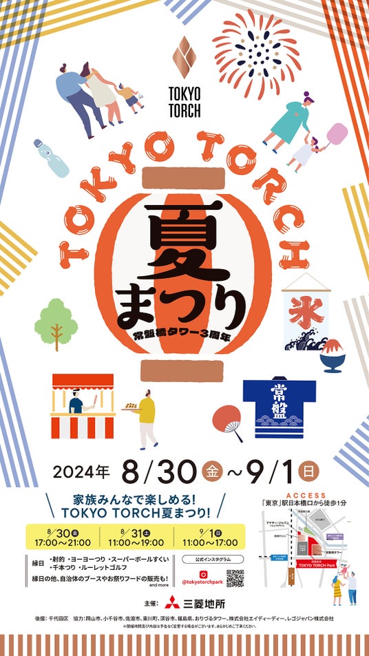 三菱地所株式会社は、東京駅日本橋口前にて開発を進めている「TOKYO TORCH」の屋外広場「TOKYO TORCH Park」にて、8月30日(金)~9月1日(日)の3日間、開業3周年を記念して、就業者や就業者のご家族・大人も子供も”みんな”で楽しめる「TOKYO TORCH 夏まつり」を開始します。