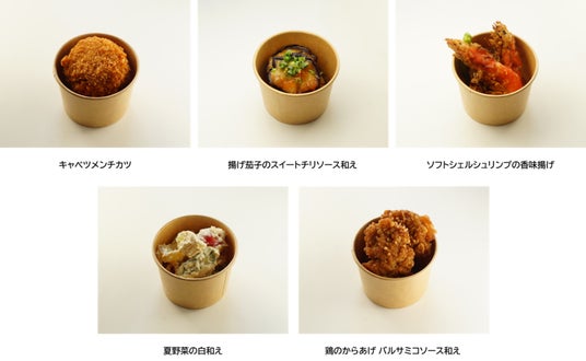 提供フード:(上段左から)キャベツメンチカツ、揚げ茄子のスイートチリソース和え、ソフトシェルシュリンプの香味揚げ、夏野菜の白和え、鶏のからあげ バルサミコソース和え。