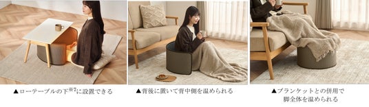 今回発売する「ぐるポカ パネルヒーター」は、1時間あたりの電気代の目安が約3.7円(※1)と、一般的なエアコン(6~14畳、約15~33円(※5))、セラミックファンヒーター(550~1200W、約17~37円(※5))と比べて、少ない電力で使用できます。形状を変更できるため、円形状だけでなくパネルを両足の間にマグネットで固定することで片足ずつ包み込めるので、ふくらはぎや足首を効率よく温められます。広げて背後に置くことで背中側も温められます。