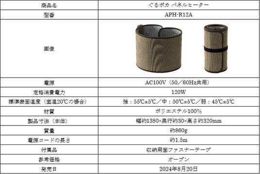 アイリスオーヤマ株式会社(本社:宮城県仙台市、代表取締役社長:大山 晃弘)は、1時間あたりの電気代約3.7円(※1)で、片足ずつ包み込むことで両足を効率的に温められる「ぐるポカ パネルヒーター」を2024年8月20日よりインターネットサイトやホームセンター、家電量販店を中心に順次発売(※2)します。