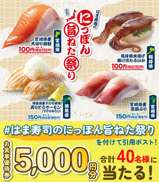 ぜひこの機会に、お近くのはま寿司で「はま寿司のにっぽん旨ねた祭り」をお楽しみください。