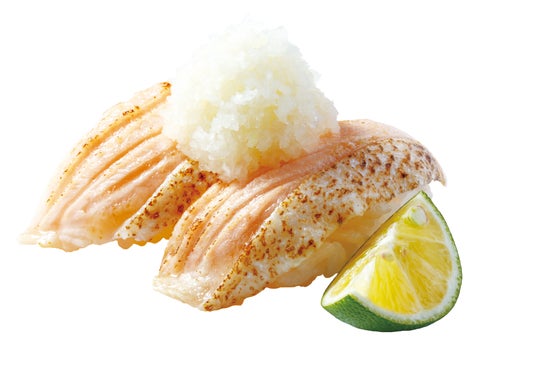 また、徳島県産スダチでさっぱりとお召し上がりいただける「炙りとろサーモン(すだちおろし)」、養殖ブリの最高峰ブランドで、脂のり抜群の「宮崎県産 黒瀬ぶり」、上品な甘みと柔らかな身が特長の「青森県水揚げ 金目鯛(もみじおろしのせ)」、もっちりとした食感と甘みが楽しめる「沖縄県産 そでいか」が登場します。日本各地の旨ねたをお見逃しなく!