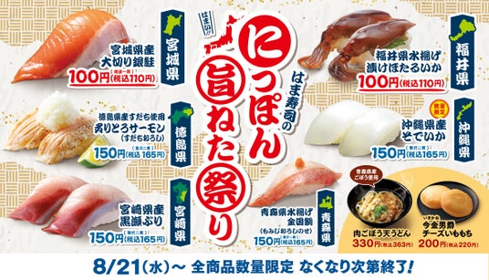 株式会社はま寿司(代表取締役社長:町野 岳 本社:東京都港区)が展開する100円寿司チェーン「はま寿司」は、8月21日(水)から「はま寿司のにっぽん旨ねた祭り」を全国の店舗で開催します。