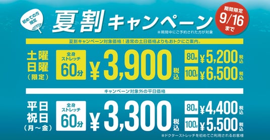 世界250店舗以上で独自技術「コアバランスストレッチ」を提供するストレッチ専門店『Dr.stretch』(株式会社nobitel、本社:東京都新宿区、代表取締役:黒川 将大)は、本日8月20日(火)から土日が更にお得な料金でパーソナルストレッチを体験できる「夏割キャンペーン」を開始する事をお知らせいたします。