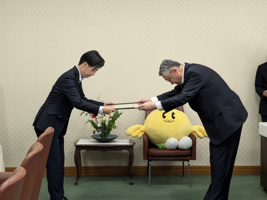 福島県庁で行われた寄付金受納式では、福島日産 金子與志幸社長が鈴木正晃副知事へ寄付目録を手渡し、鈴木副知事より感謝状が授与されました。