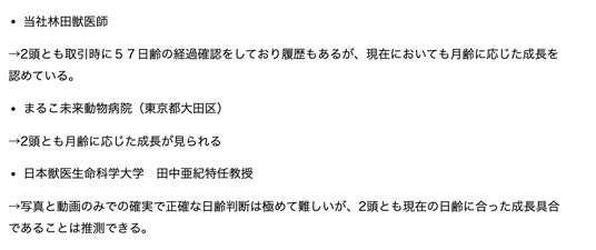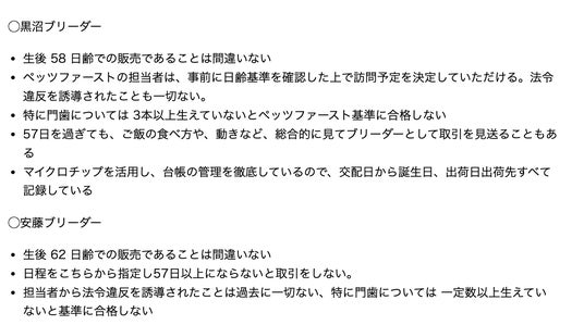 このように、複数の獣医師の意見、2名の当該ブリーダーのヒアリング結果などより、また取引の際には社内のダブルチェックが徹底されていることから 取引時のブリーダーが提示した日齢に間違いはなく、2頭とも57日齢を超えた適法での取引であると判断をしました。