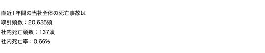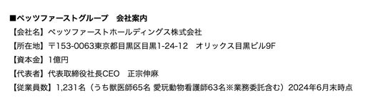 なお、本訂正に関しましては該当ブリーダーに対する数値集計の際の誤りで、毎月報告をしておりますマンスリーペットレポートの数値、直近1年間の死亡頭数137頭および死亡率0.66%には変更、誤りはございません。