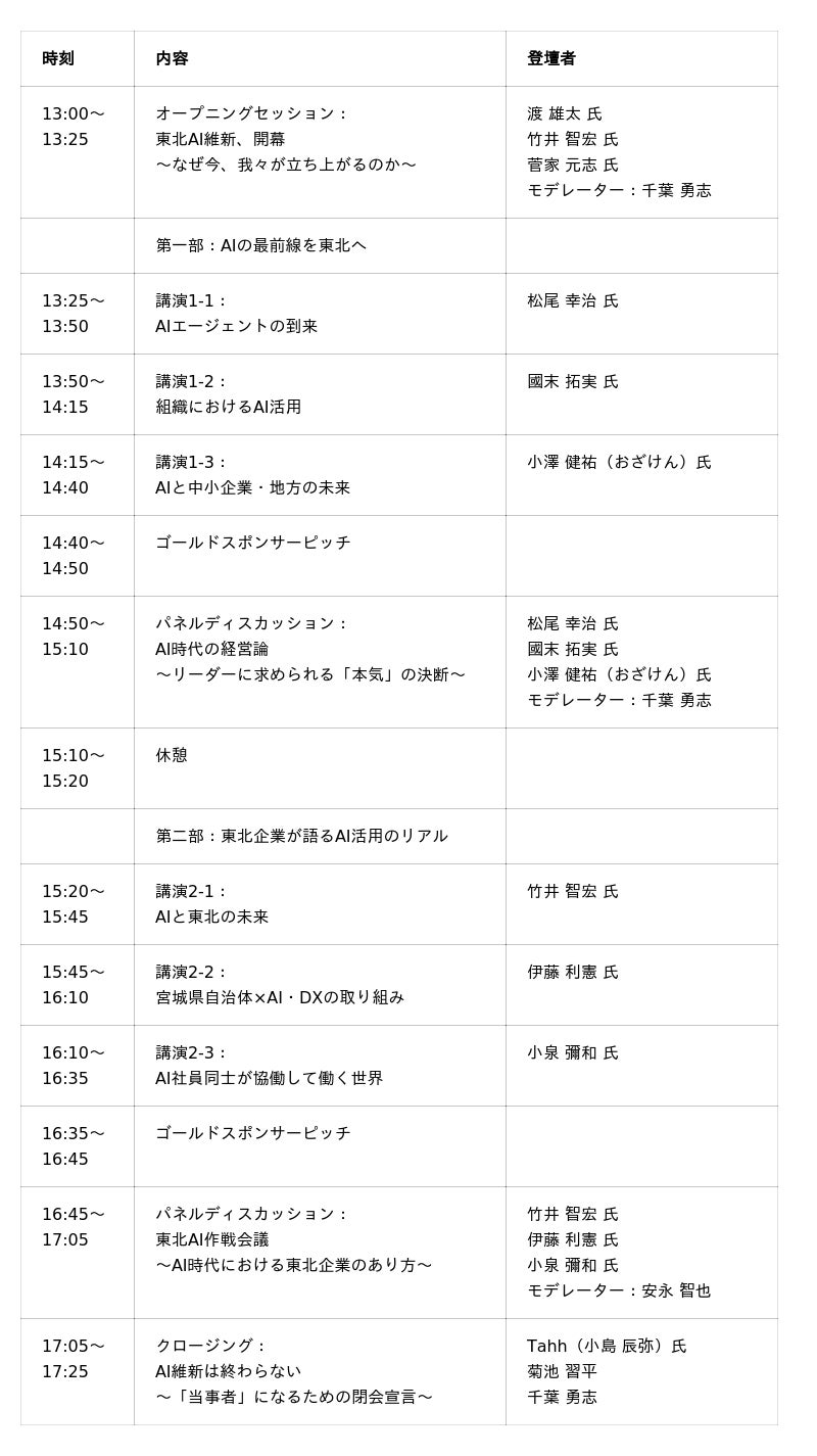 本カンファレンスは、AI活用の最新トレンドを学ぶ「第一部:AIの最前線を東北へ」と、具体的な導入事例に焦点を当てた「第二部:東北企業が語るAI活用のリアル」の二部構成です。