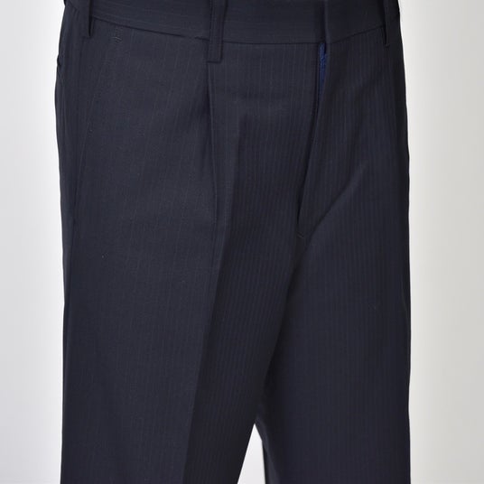濃紺を基調に、一見すると無地調の「シャドーストライプ」を織り込んだオリジナル柄です。スマートなワンタック入りストレートシルエットで、性別に関係なく着やすいスタイルです。