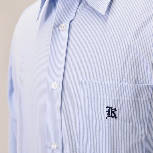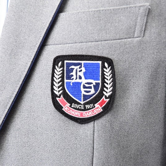 左胸のエンブレムは、学園のイメージカラーであるピンクを差し色に使用し、オリジナルで制作しました。清潔感のあるブルー&ネイビーを土台に、九里学園の頭文字「K」「G」を爽やかな白文字で中央に配した上品なデザインです。