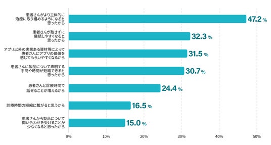 2024年6月から提供を開始した「CureApp 血圧チャレンジプログラム」。高血圧症治療アプリの処方にプラスに働くと考える医師が63.5%。その理由として、「患者さんがより主体的に治療に取り組めるようになると思った(47.2%)」「飽きずに継続しやすくなると思った(32.3%)」という回答が多かった。