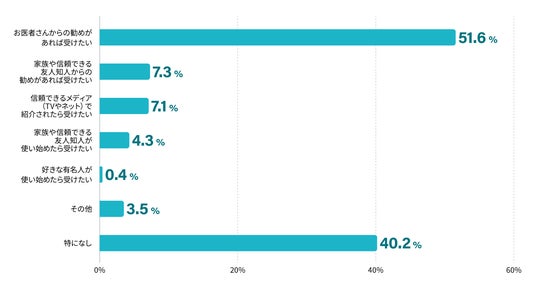 医師に高血圧症治療アプリの処方に繋がりそうな環境の変化を聞くと、「患者から求められることが増えたら」が65.6%。一方で、高血圧治療者の場合、「お医者さんからの勧めがあれば受けたい」と思っている方は51.6%。双方の思いはありつつもお互い言い出せていないのが現状である。