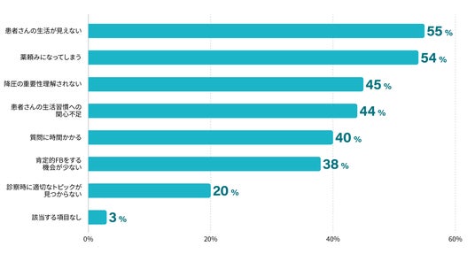 本結果から、生活習慣改善が重要だと思っている人は医師・患者さんともに多いことがわかりました。一方で、指導が上手くいっていないと感じる医師は半数以上であり、生活習慣指導に課題を感じている医師に高血圧症治療アプリのニーズが高いのではないかと考えられます。