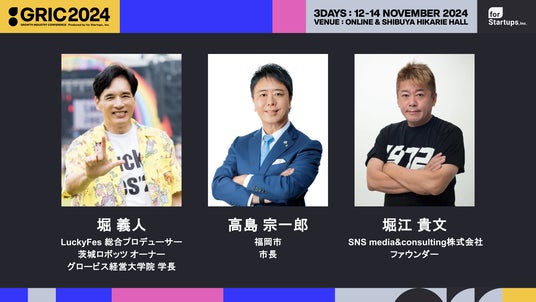 LuckyFes 総合プロデューサー/茨城ロボッツ オーナー/グロービス経営大学院 学長 堀 義人氏、福岡市 市長 高島 宗一郎氏、SNS media&consulting株式会社 ファウンダー 堀江 貴文氏