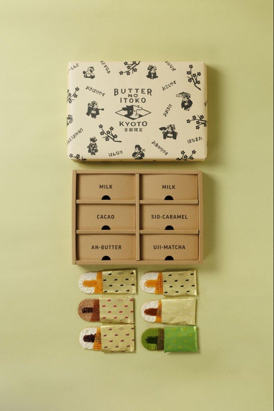 バターのいとこのキャラクター「いとこちゃん」が可愛らしい舞妓さんになってさまざまな表情を見せてくれるデザインとなっており、京都土産としてはもちろん、贈答品にもおすすめの毎日数量限定のアイテムです。