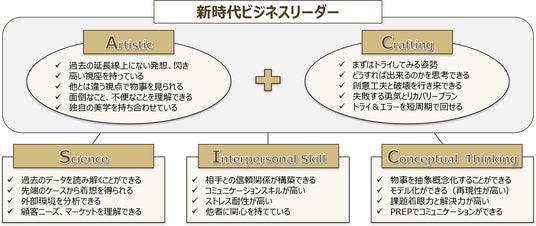 カナダの経営学者ヘンリー・ミンツバーグ氏が提唱する経営者に求められる3つの要素「Artistic」(発想力)、「Crafting」(実践力)、「Science」(科学)に加え、当社エグゼクティブトレーナー宮本竜弥が、国内外のビジネスリーダー25,000名以上へのトレーニング、大学での講師や自身の会社経営、売却の経験を元に、「Interpersonal Skill」(人間力)、「Conceptual Thinking」(概念化能力)の要素を加え、新時代ビジネスリーダー(次期経営幹部)に求められるスタンス・スキルを定義しました。