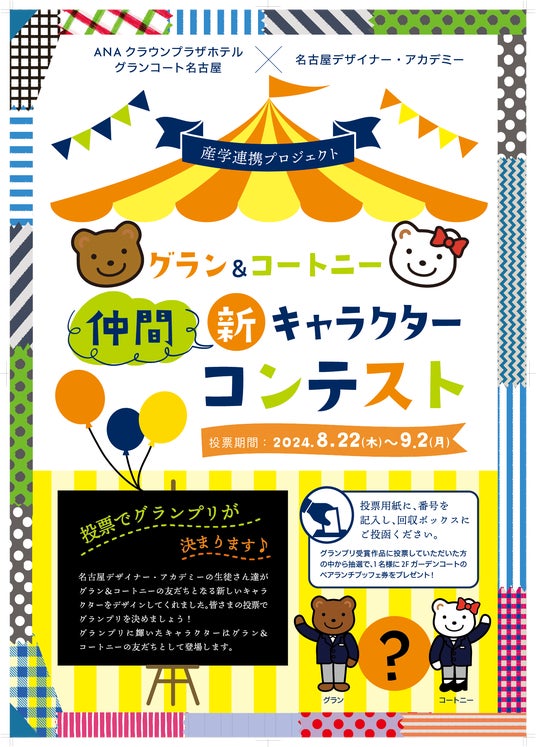 ANAクラウンプラザホテルグランコート名古屋で親しまれている、既存のキャラクター「グラン&コートニー」。学生目線でホテルのお客様に親しまれるようなグラン&コートニーの仲間をコンセプトにした、新キャラクターのデザインコンテストを実施します。