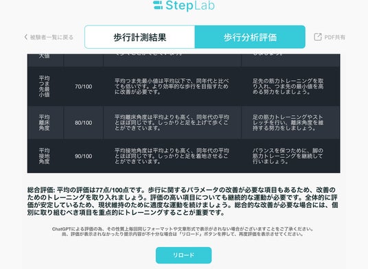 計測された歩行因子は、学術論文からの抽出と複数の実計測により収集した平均歩行データ数値をリファレンスデータとしてChatGPTに提供する事で比較をさせ、評価コメントと採点を提供すると共に、改善のための簡易的なトレーニングアドバイスもフィードバックいたします。これにより数値だけでは難しい患者様などの被験者への評価やアドバイスが、どなたでも簡便的に実施する事が可能となります。
