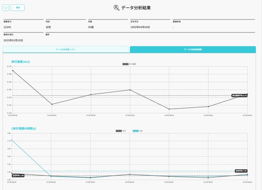 計測した歩行データは、クラウド連携機能によりパソコンやスマートフォンのブラウザで閲覧可能になりました。またクラウドでは被験者のデータ推移や、全国平均との比較が行え、計測端末が複数台にまたがる場合でも自施設の被験者データを一元管理する事が可能となりました