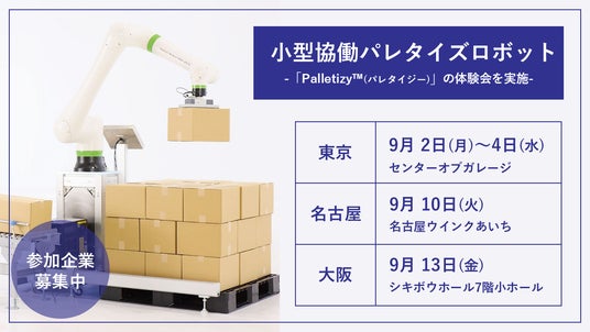 AIロボット開発の株式会社Closer(代表取締役:樋口翔太、本社:茨城県つくば市、以下「Closer Robotics」)は、2024年9月に、東京・名古屋・大阪にて、小型協働パレタイズロボット「Palletizy(TM)(パレタイジー)」の体験会を開催します。