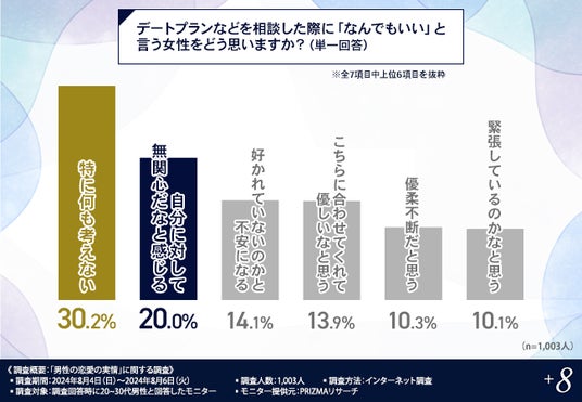 「デートプランなどを相談した際に「なんでもいい」と言う女性をどう思いますか?(単一回答)」と質問したところ、『特に何も考えない(30.2%)』と回答した方が最も多く、次いで『自分に対して無関心だなと感じる(20.0%)』『好かれていないのかと不安になる(14.1%)』と続きました。