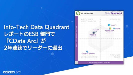 2024年8月23日 - CData Software Japan 合同会社(本社:アメリカ・ノースカロライナ州、日本オフィス:宮城県仙台市、代表社員 職務執行者:疋田 圭介、以下CData)は、当社の『CData Arc』が、SoftwareReviews による2024年Info-Tech Data Quadrant レポートのEnterprise Service Bus(ESB)部門において、2年連続でリーダーに選出されたことを発表します。Microsoft やMulesoft という業界大手と並んでリーダーとして選出されたことは、CData Arc の卓越した性能とユーザーの満足度を示すものです。CData Arc は、エンタープライズから中小企業(SMB)に至るまで、幅広いビジネスニーズに応える多様な機能と高品質なサポートを提供し、ユーザーのB2B 連携および業務自動化を支援します。