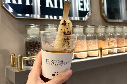 「田沢湖カレー」はパーソナリティの堀井美香さんの出身地、秋田県名物のきりたんぽをカレーにディップして食べる斬新なスタイルの商品。今回は、ニシキヤキッチンで人気の「豚の角煮カレー」とのコラボ商品となります。