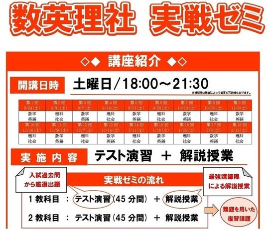 数学、英語、理科、社会のそれぞれでテスト演習と解説授業を行います。宮城県の実際の入試では各教科50分で実施されますが、実戦ゼミでは45分間のテスト時間とすることで、より素早く問題を解く力を鍛えていきます。
