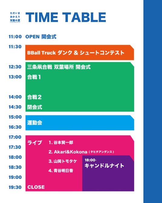 今年はバスケットの普及を通じてさまざまなコミュニティづくりやイベント企画を行うクリエイティブ集団・「SpaceBall Mag」とともに、特設バスケットコートを展開し、「BBall Truck ダンク&シュートコンテスト」を開催!新潟三条凧(いか)協会による復興六角凧合戦や、夏ならではの運動会、夕方からはライブとキャンドルナイトも行います! 様々なアクティビティを通して双葉の皆さんと、心の交流を深めたいと思います。