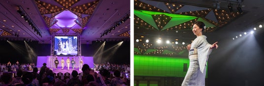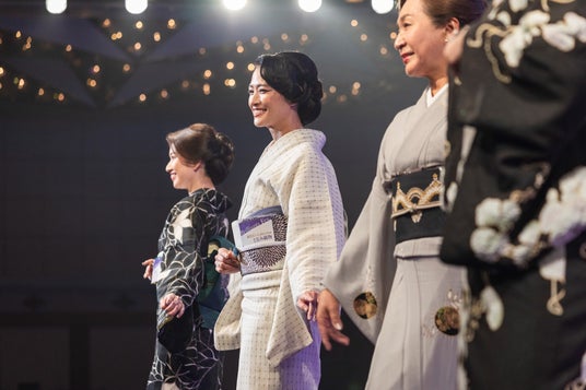 約500名ものきもの姿が一堂に会する様は圧巻。華やかなスポットライトを浴びランウェイを歩く出演者たち。