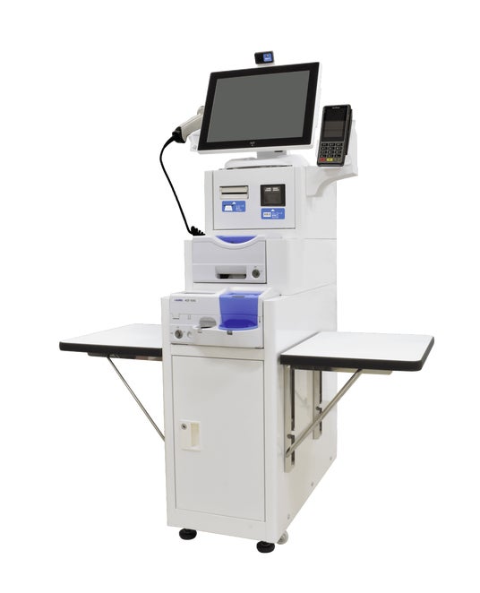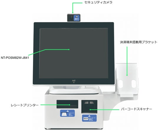 レシートプリンター、バーコードスキャナー、自動釣銭機を内蔵搭載し、ハンドスキャナー、決済端末搭載用ブラケットとセキュリティカメラを装備しています。