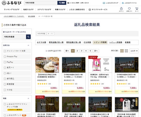 「ふるなび」令和5年度産のお米返礼品検索結果画面