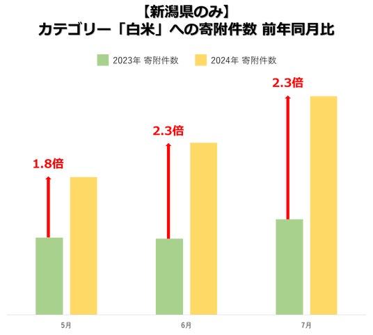 2023年と2024年の前年同月比で最大1.8倍に増加。特に、日本一の米生産量を誇る新潟県では前年同月比で最大2.3倍にも達し、多くの人がふるさと納税を活用してお米を確保している事が見受けられた。