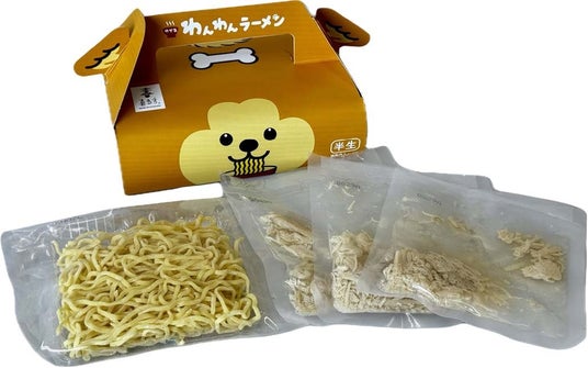 "Wanwan Ramen" is a dog-friendly ramen that replicates the signature flat, wavy medium-thick noodles of Kitakata Ramen. The noodles are made with carefully selected wheat flour and Kitakata's renowned "Togaminedake Spring Water," ensuring a high-quality product. The ramen is paired with a salt-free broth made from chicken and scallop extracts, along with a topping of domestically sourced chicken breast, creating a delicious treat that is sure to delight your pet.