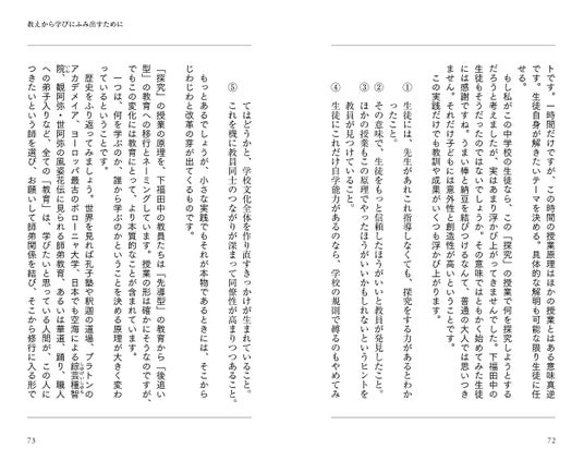 なお、本文各章末には、具体的な事例を参考にしながら、少しずつでも子どもの「学び」を変えるために一歩ふみ出すことができるかについて、汐見稔幸氏がまとめた【教えから学びにふみ出すために】を掲載。