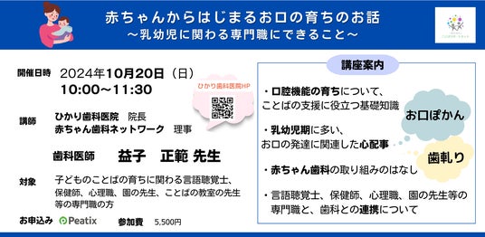 一般社団法人ことばサポートネットは、2024年10月20日オンライン講座『赤ちゃんからはじまるお口の育ちのお話』を開催。口腔機能の育ちや咬合異常など、”赤ちゃん歯科”の視点から学びます。