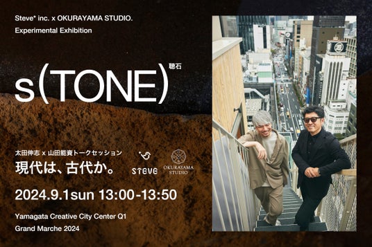 ブランディングや商品開発を、その瞬間だけではなく「未来にどのような影響を与えるか」を考えてお客様と共に併走することを目指すクリエイティブカンパニー、株式会社スティーブアスタリスク(本社:東京都中央区、代表取締役:太田伸志、以下「Steve* inc.」)は、アート・デザイン・建築の分野で活躍するクリエイターの方々と協業しながら、アートピース、建築、そしてプロダクトなど、さまざまな形で伊達冠石の力強さと美しさを世に送り出している大蔵山スタジオ株式会社(本社:宮城県丸森町、代表取締役:山田能資、以下「大蔵山スタジオ」)とともに、やまがたクリエイティブシティセンターQ1 Steve* CREATIVE LOUNGEにて、地域資源の新しい可能性を探るアートプロジェクト「s(TONE)」の展示を行います。また、展示に伴い太田伸志と山田能資によるトークセッションを9月1日(日)13:00-13:50で開催予定です。