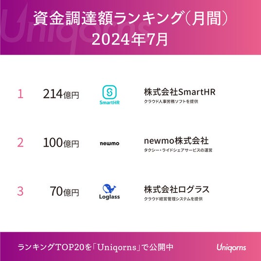国内最大級のスタートアップメディア「Uniqorns(ユニコーンズ)」が2024年7月のスタートアップ資金調達状況をランキング形式で発表