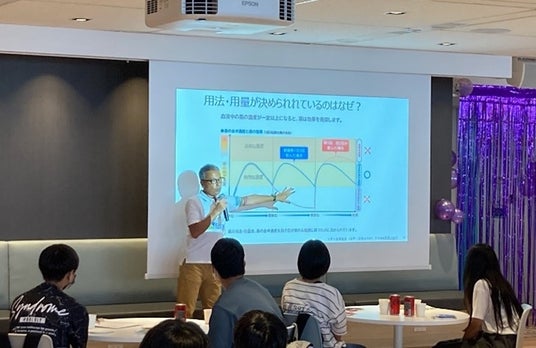 座学による「お薬が効くしくみと正しい使い方を学ぼう」のパートでは、薬剤師でもあるエスエス製薬の社員から、自分自身の健康について正しく知る事、薬が効くしくみや正しい使い方、薬剤師/医療従事者に健康や服薬の相談をすることの重要性について、オーバードーズなどの問題も交えながら解説しました。