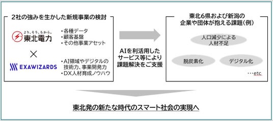 業務提携により、東北電力が有する各種データや顧客基盤等の事業アセットと、エクサウィザーズが有するAI領域のサービス企画力、DX人材の育成ノウハウなどを相互に持ち寄り、東北6県および新潟県の企業や団体が抱える人材不足などの課題解決に向けた新規事業を検討してまいります。