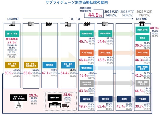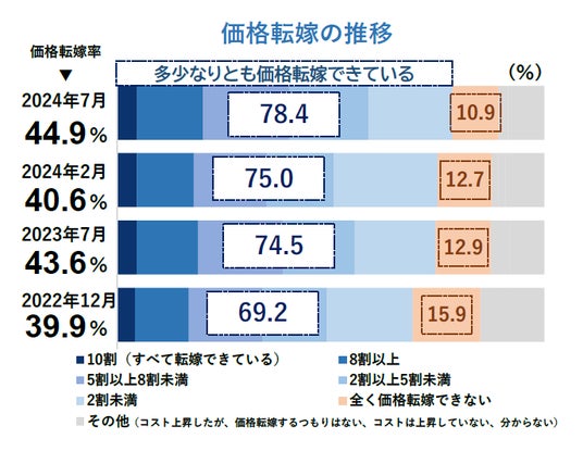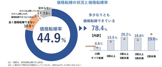 また、コスト上昇分に対する販売価格への転嫁度合いを示す「価格転嫁率[1]」は44.9%となった。これはコストが100円上昇した場合に44.9円しか販売価格に反映できず、残りの5割以上を企業が負担していることを示している。
