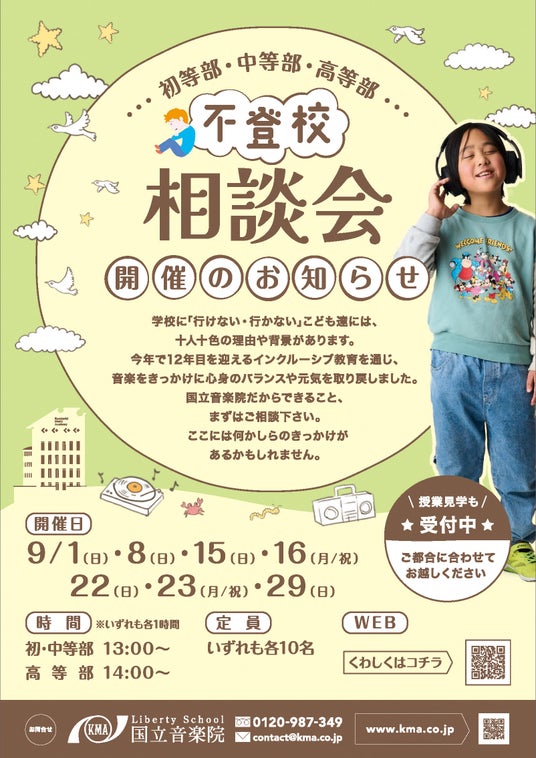 GLIONグループ(ジーライオングループ 所在地:兵庫県神戸市)は、同グループが東京、宮城、鳥取にて運営を行う国立音楽院(くにたちおんがくいん 東京本校:東京都世田谷区池尻 3-28-8)にて、学校へ行けない・行かない小学生から高校生を対象に「不登校相談会」を開催いたします。