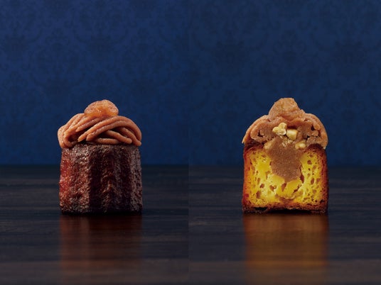 栗風味のカヌレにモンブランペーストを絞り、キャラメルナッツで食感のアクセントをプラスしました。トッピングにはマロングラッセを飾りかわいらしく仕上げました。