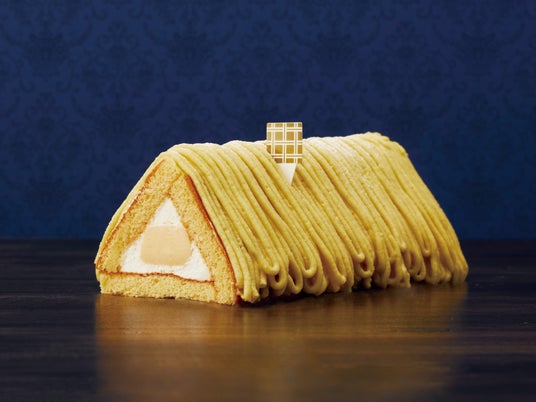 なめらかなカスタードプリンをふんわりスポンジで包み、たっぷりとマロンクリームを絞りました。おうちのような三角形の形が特徴的。