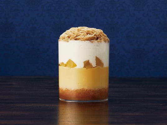 和栗を使ったモンブランをほんのりお酒を効かせたサバランへと仕立てました。香ばしく焼き上げラム酒とバニラのシロップを染み込ませたサバラン生地に、なめらかなプリン生地と口どけの良い生クリームを重ね、和栗のペーストを糸状に絞って仕上げた4層重ねのモンブラン。