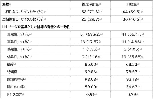 ■対象者26名(月経周期74サイクル)を対象に、推定深部温と口腔温の二相性変動から各周期の排卵の有無を推定し、尿中の黄体形成ホルモンの上昇(LHサージ)に基づく判定結果(排卵有無)との一致性を検証しました。
