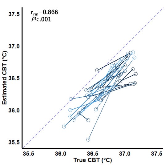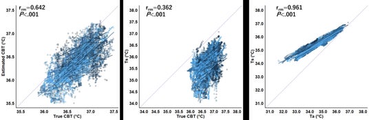 睡眠中の消化器温(横軸)と推定深部温(縦軸)の関係を表しています。消化器温は ピル型のe-Celsius(BodyCap社)を摂取して測定しました。結果としては、二つの温度が等しいことを示すライン(青点線)から下にずれていることから、実測した深部温(消化器温)と比較して、推定深部温の方が低く見積もられています。しかし、対象者毎に卵胞期(低温期)と黄体期(高温期)の温度変化の関係性を調べると(実線)、消化器温と推定深部温に高い相関関係が認められています(rrm=0.642)。
